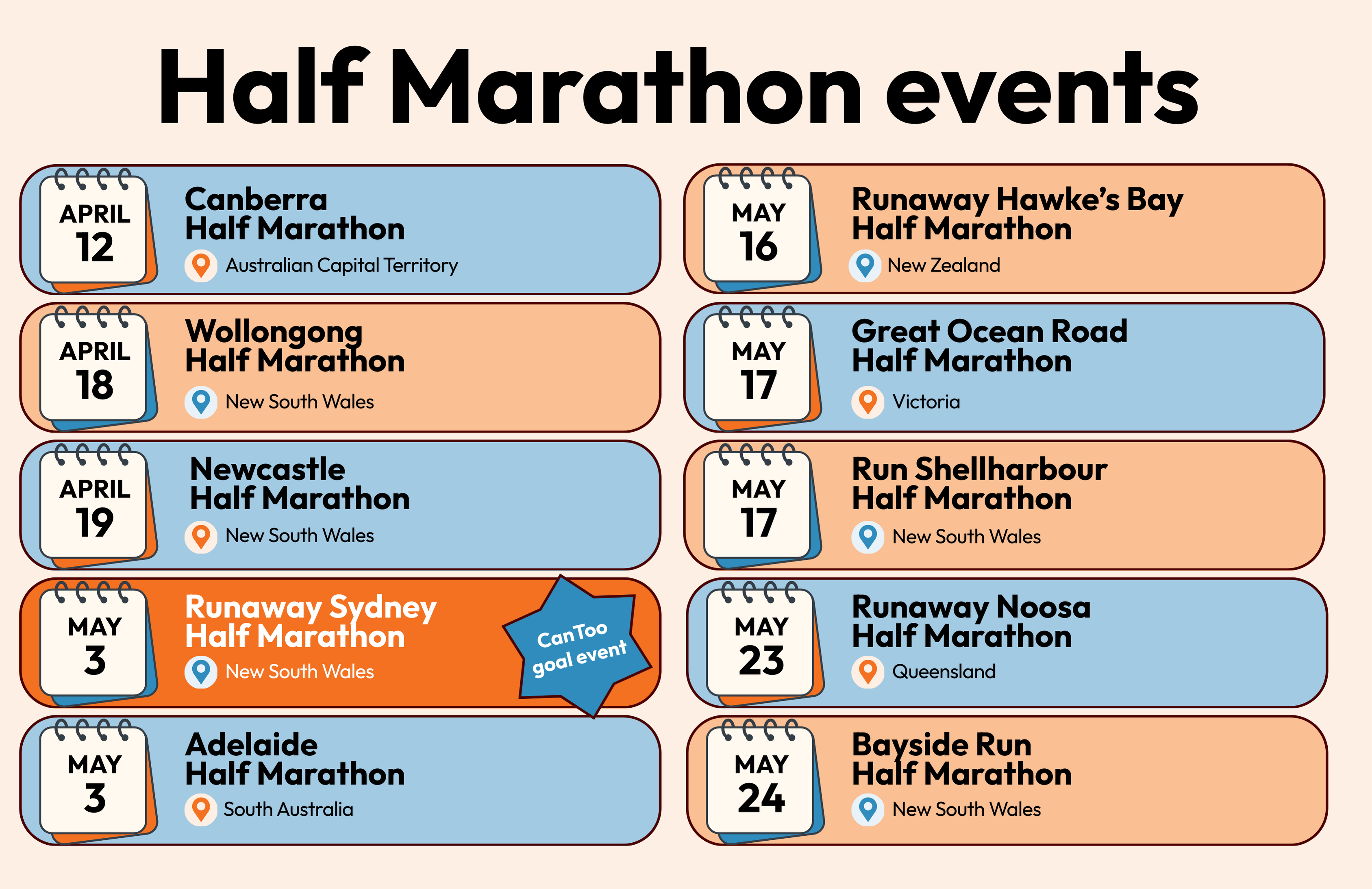 Take on the Runaway Sydney Half Marathon goal event at the end of your program on Sunday 3 May! Alternatively, check out the other half marathon events below that are on in April/May.