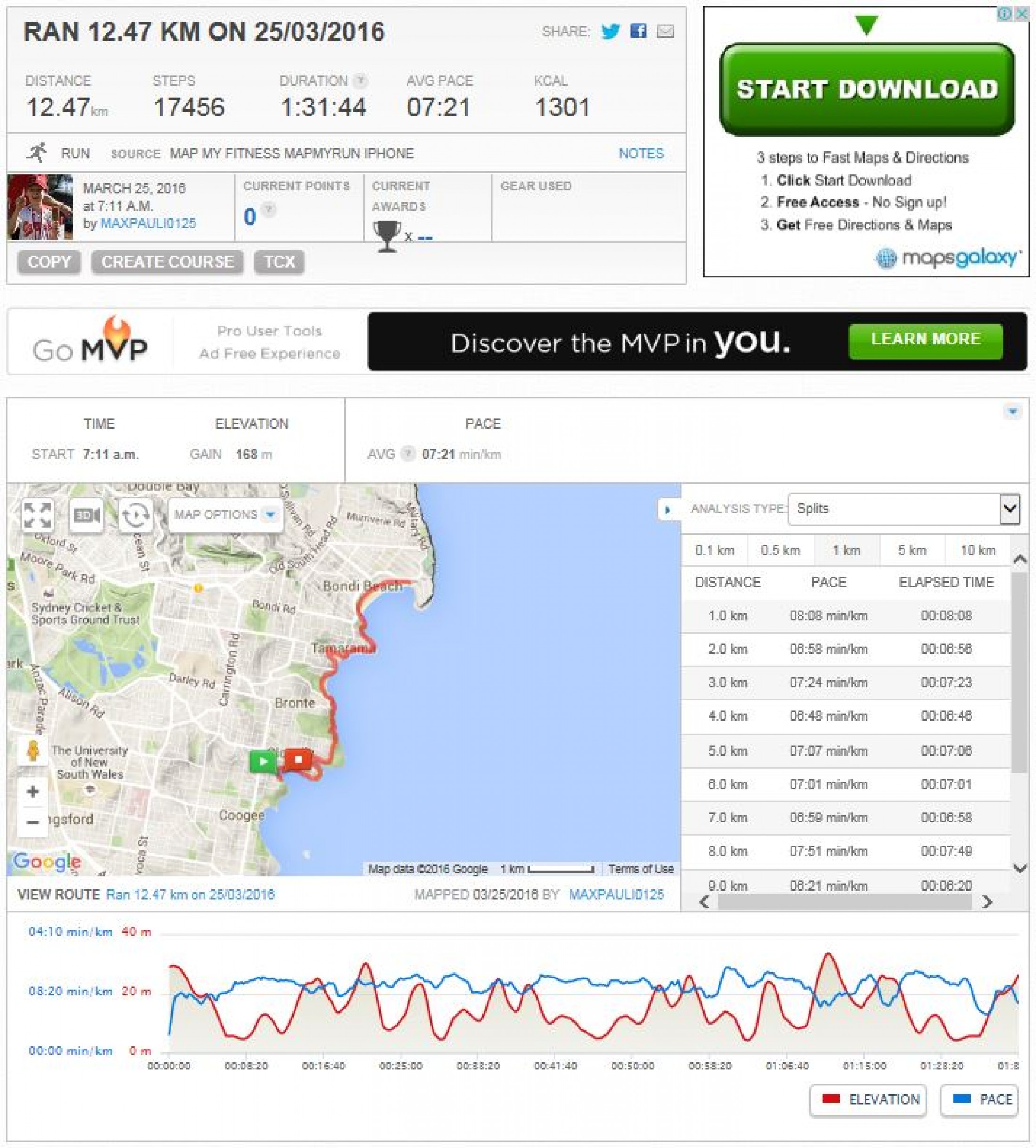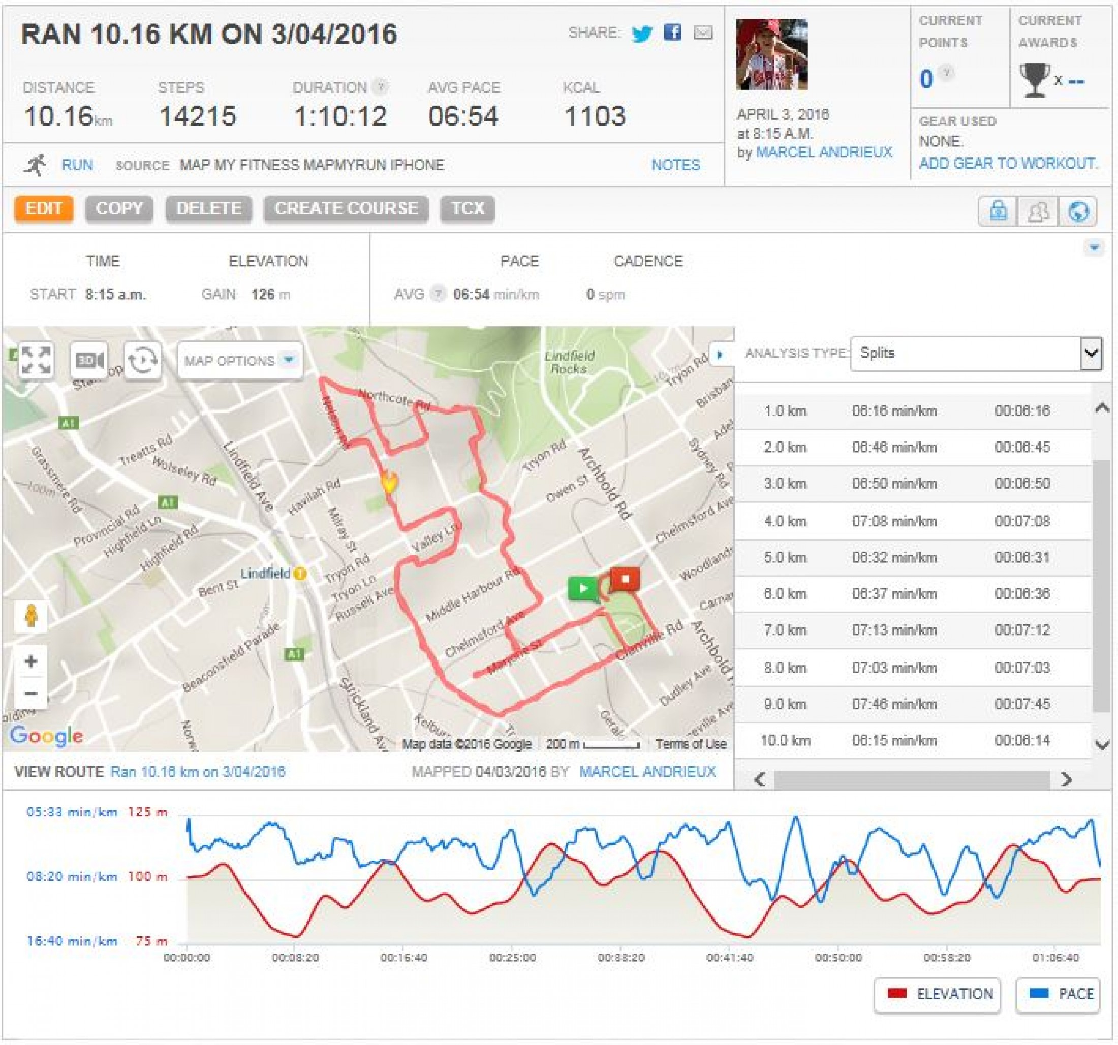 But, I managed to maintain a reasonable average pace of just under 7min/km (faster than last week's Bondi run) and I figure, if I can do that on this course, I'm a fair chance of doing better in the Half Marathon in a few week's time.