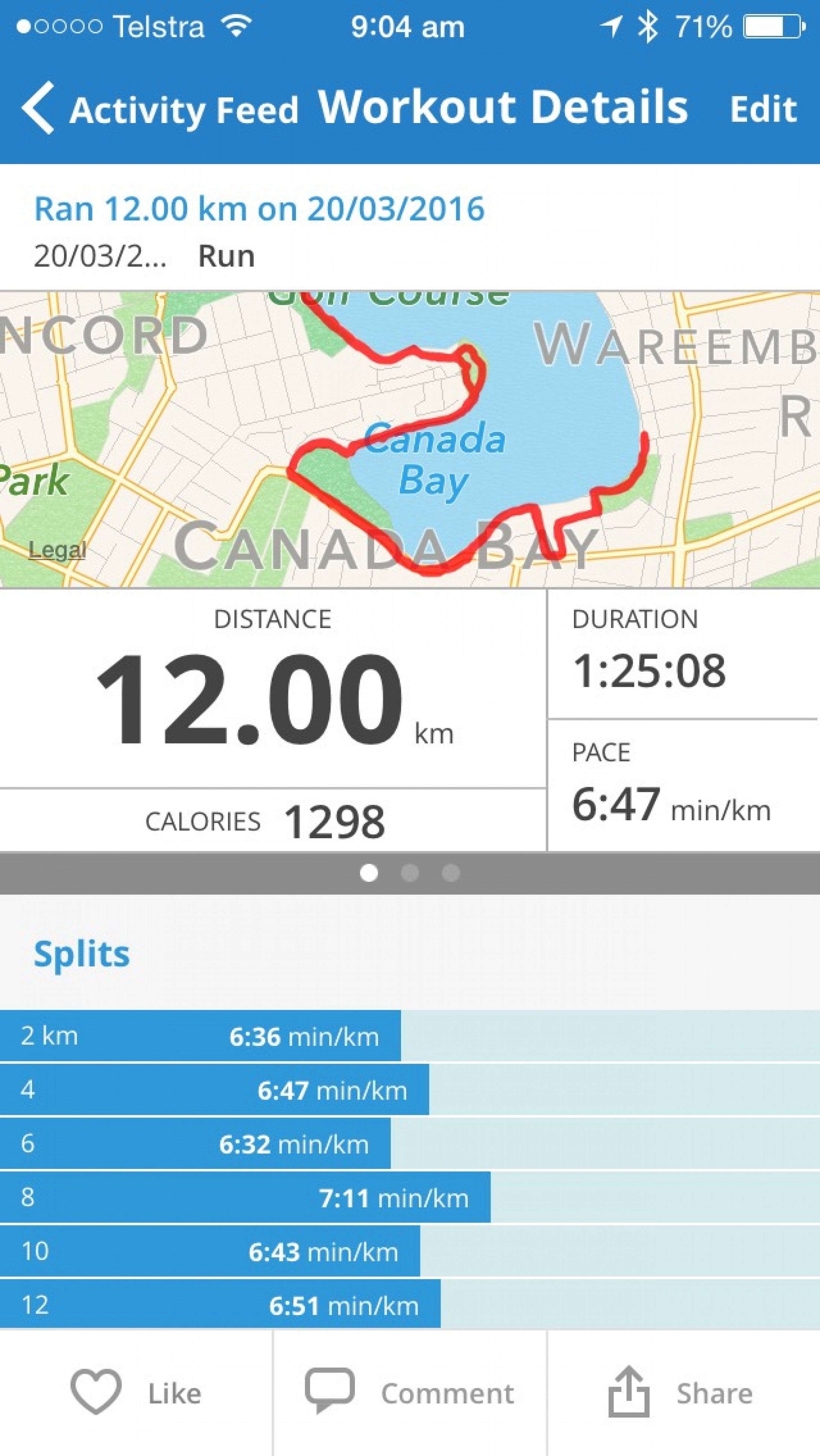 With no official coached session on the easter weekend, some of the ladies from my pod decided we would get together and do the Coogee to Bondi run and back on good Friday. It was a tough 12km with LOTS of stairs so really hard to get a good rhythm going. As a result my splits were not so perfect as Wednesday's Benchmark and overall pace was a lot slower than I would have liked but I completed the run and didn't feel too bad afterwards.