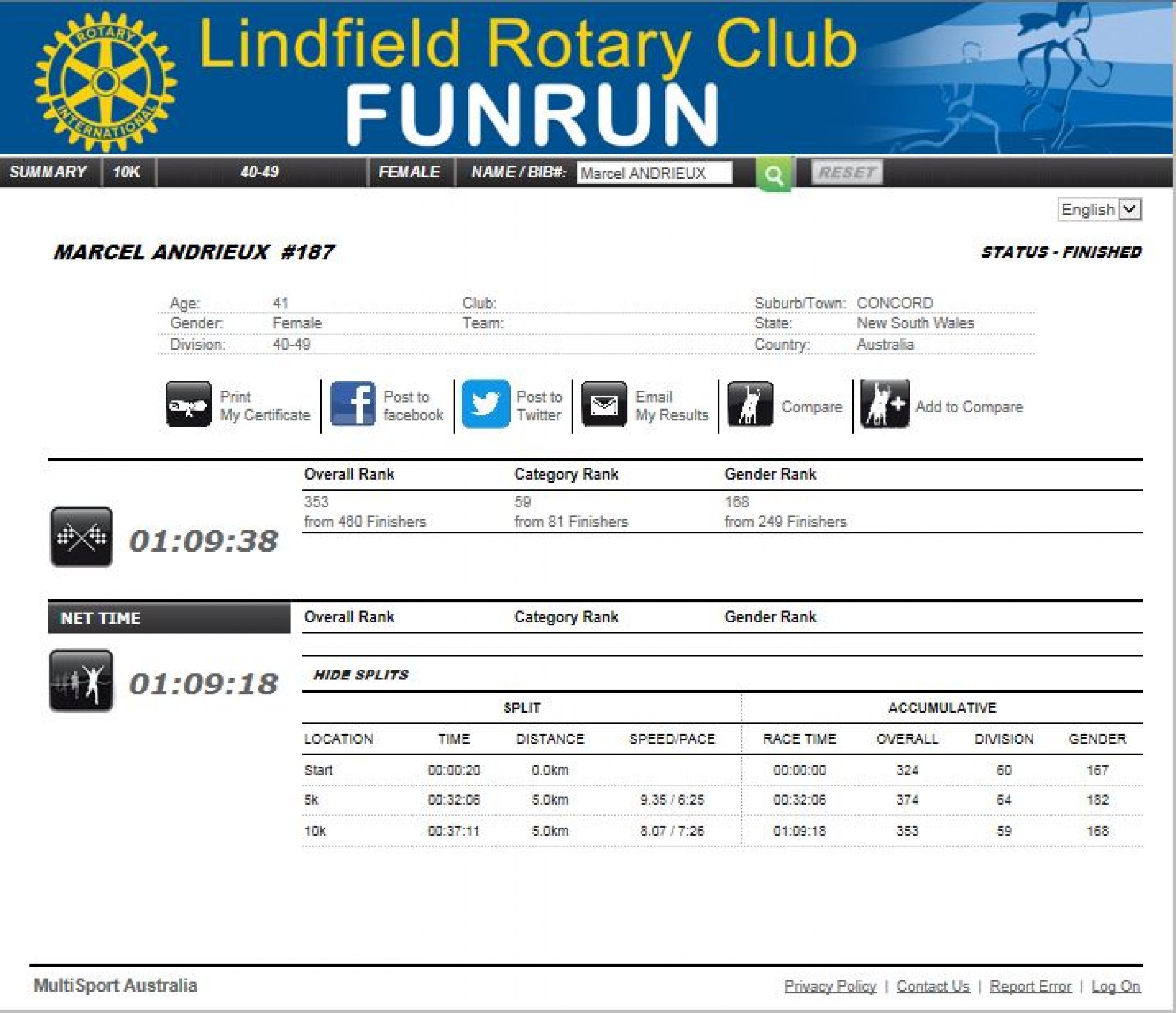 Then on Sunday we had the Lindfield "Fun" Run - let me tell you, there was not much fun about it! We were warned that it was tough. We were warned that it was hilly. But this was a BRUTAL 10km of almost unrelenting hills! It was two laps of a 5km course and there was a reasonable amount of walking up hills I must admit (especially on the second lap).
