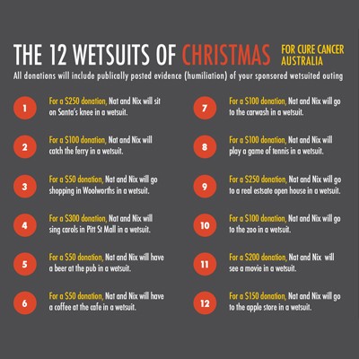 To add some festive cheer to our fundraising for Cure Cancer Australia, we are offering you 'The 12 Wetsuits of Christmas.'